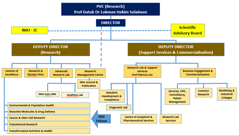 The Institute for Research, Development and Innovation (IRDI) was established on 18 September 2012 in lined with the IMU’s strategic plan ASPIRE (2011-2015) to be an innovative global centre of excellence in learning and research. The IRDI was officially launched by the Chancellor, Dato’ Sri Dr. T. Devaraj on18 September 2012. The mission of IRDI is to be recognised as a leading private research institute in Asia that creates value through integrating education, healthcare and research.